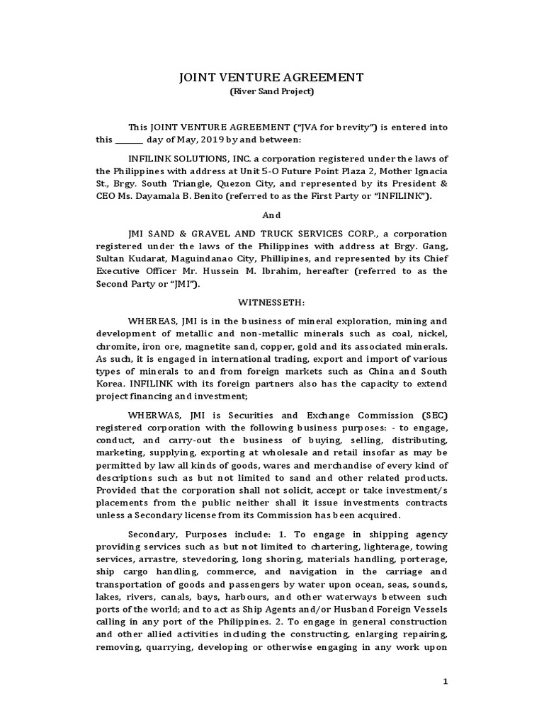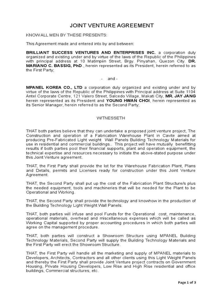 Sample joint venture agreement construction project philippines. However there is a framework that allows LGUs to enter into joint venture agreements. The business of the Joint Venture shall be to execute and manage several separate projects in the Philippines. Such joint venture need not be.
